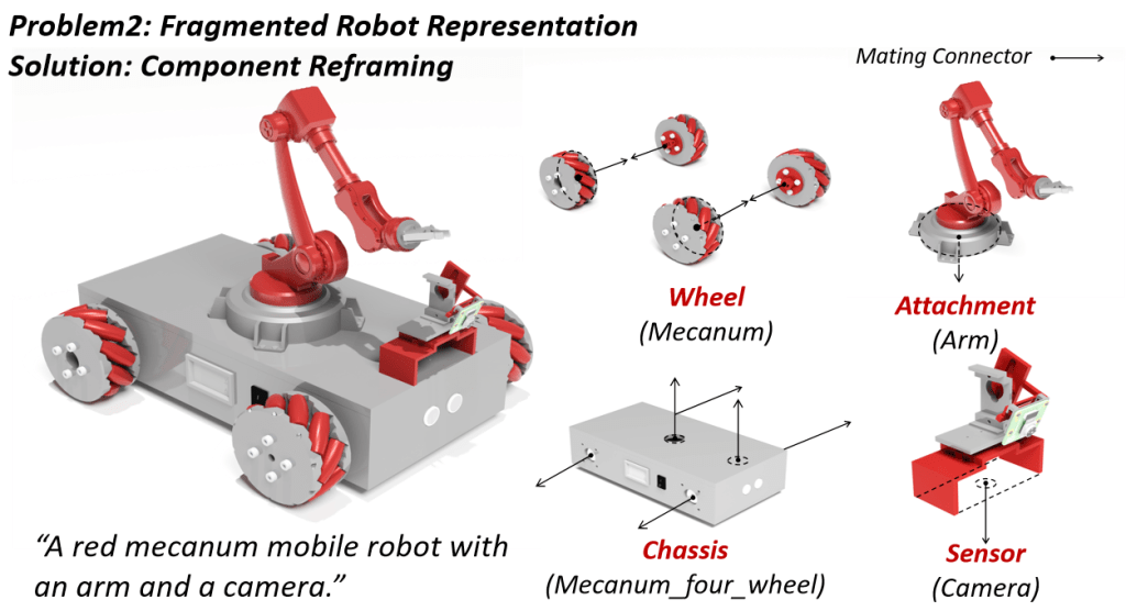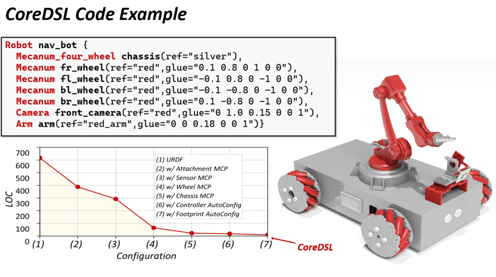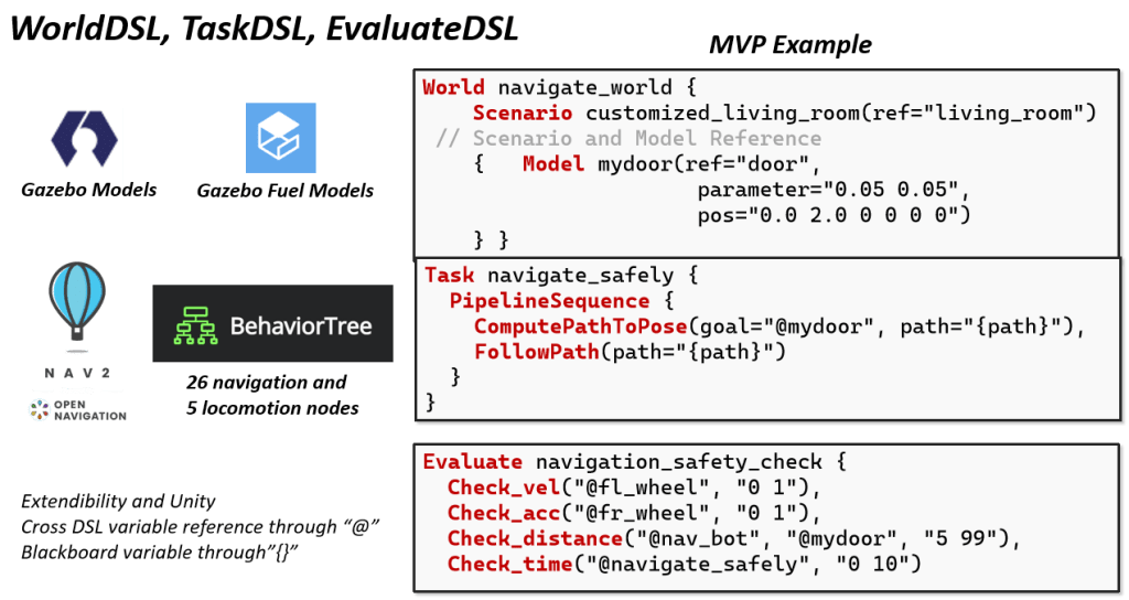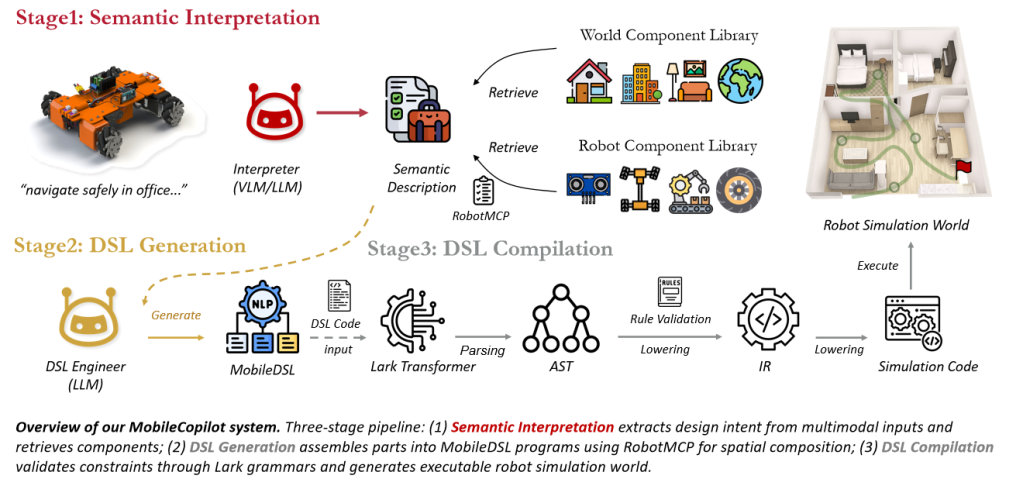 To solve problem1, CoreDSL introduces the Robot Mating Connection Protocol. instead of manual coordinate calculation, components connect through typed mating ports to alleviate complex spatial calculation.For problem2, CoreDSL introduces Component Reframing — a taxonomy that organizes robots into four categories: wheels, chassis, sensors, and attachments. This hierarchy cuts ambiguity and speeds setup, since choosing a subtype also links to the right controller while keeping parameters flexible.CoreDSL tackles Problem 3: Manual Configuration with Automated Configuration. It infers both the footprint and controller from RobotMCP connectors, unifying ground-contact geometry with kinematic models like wheel order, wheelbase, and radius — so robots can be modeled without manual setup.Our CoreDSL creates the robot with only 8 lines of code, whereas the equivalent URDF description requires nearly 600 lines, which demonstrates the effectiveness of our DSL.We introduce three more DSLs for end-to-end development: 1) WorldDSL builds environments, 2) TaskDSL encodes behaviors with behavior trees, and 3) EvaluateDSL tests physics and task performance.Based on MobileDSL, the MobileCopilot system follows a three-stage pipeline: (1) Semantic Interpretation extracts design intent from multimodal inputs and retrieves components; (2) DSL Generation assembles them into MobileDSL programs using RobotMCP for spatial composition; (3) DSL Compilation checks constraints with Lark grammars and produces an executable robot simulation world.